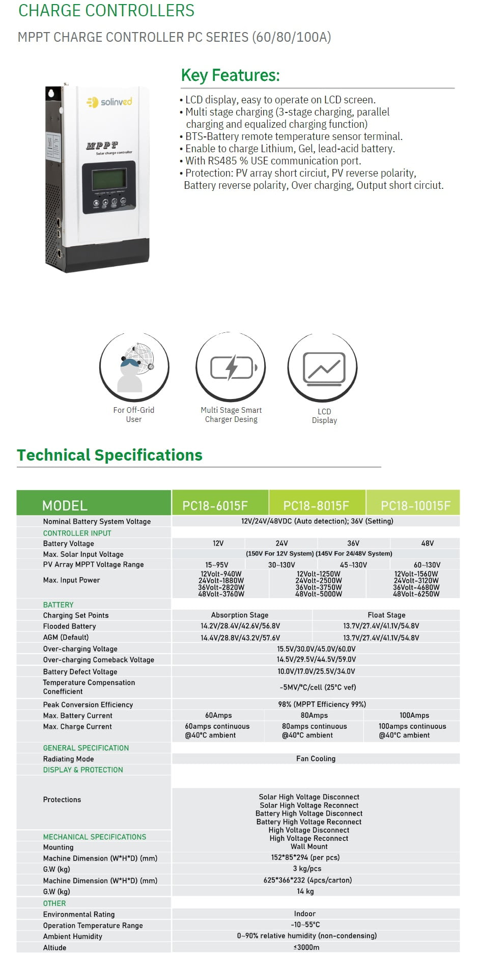 Solinved 80A Mppt Şarj Kontrol Cihazı 12/24/36/48 V PC18-6015F